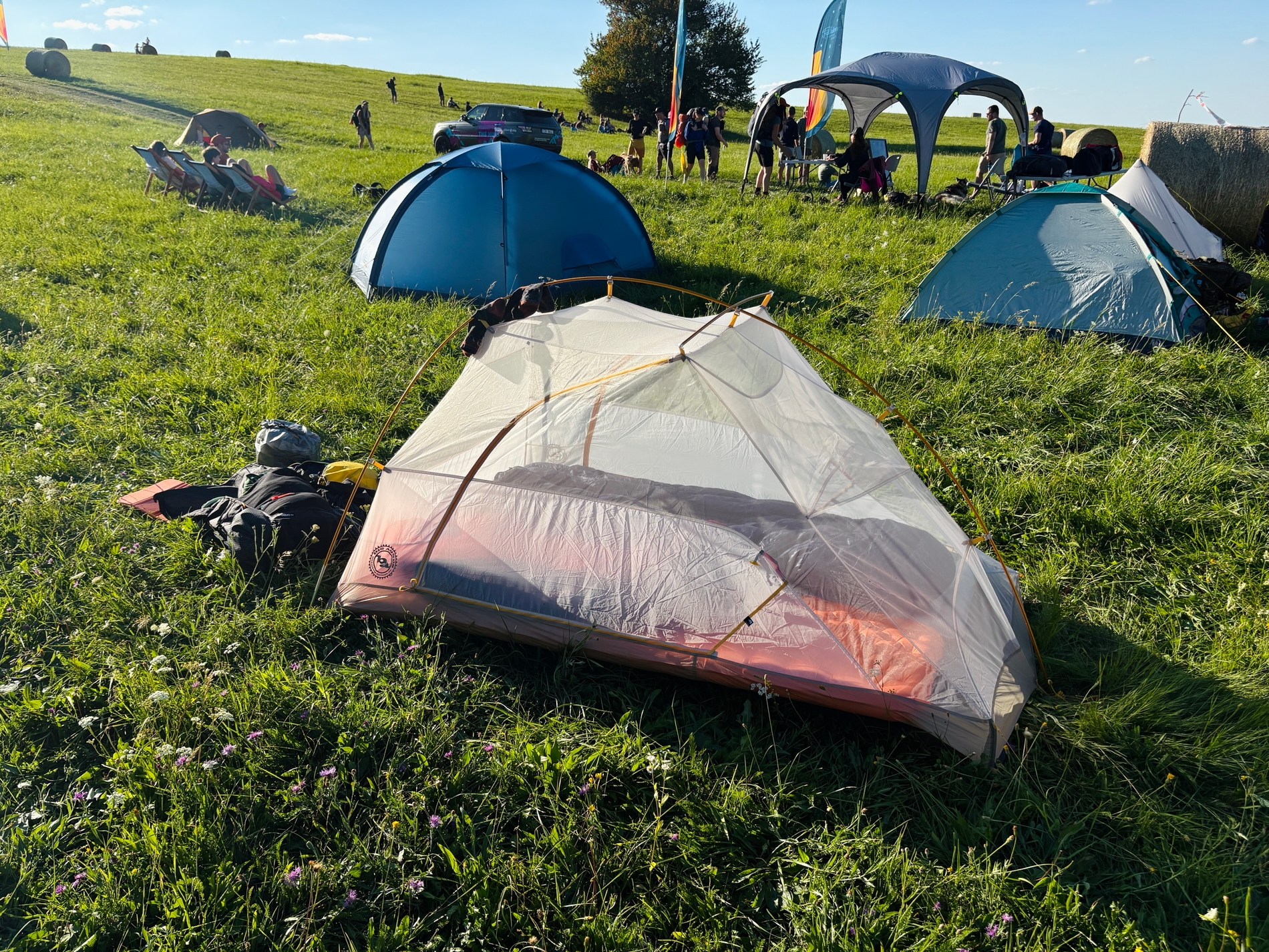 Poslední kilometr už ho opět nesu na koníčka. V cíli se registrujeme, nacházíme si místo na stan a jdeme ho postavit. Pak už jen večeře a kolem 19. hodiny jdeme do spacáků. Chvíli po sedmé už byl tuhý! Doufám, že se dobře vyspí a zítra nás budou čekat další dobrodružství.