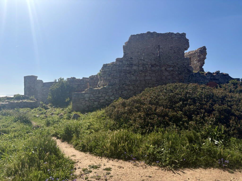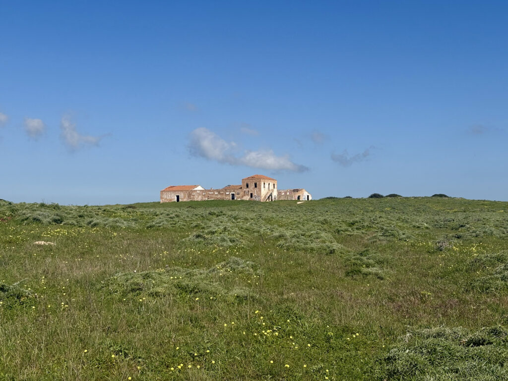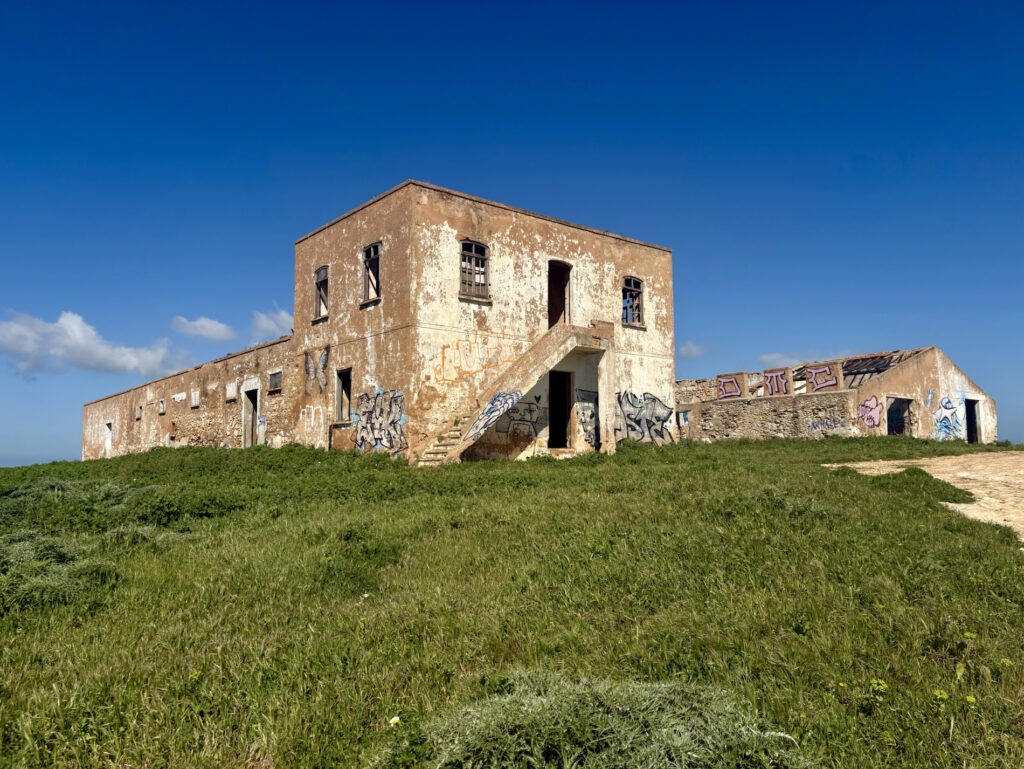 Ta hladina hraje všemi odstíny – od úplně světlé přes nádhernou „blankytnou“ až po hlubokou temnou modř. Jsou tu nádherné pláže plné písku a ta průzračná voda! Úplně mě to lákalo se okamžitě vykoupat. Takových pláží dnes nacházím mraky. Fishermans Trail mi v tuhle chvíli ukazoval svou nejkrásnější tvář. Cesta se pak vlní nahoru a dolů, procházím kolem tajemných rozbořených budov ve vnitrozemí a kolem půl dvanácté zjišťuji, že mám v nohách teprve 12 kilometrů. Cítím se super a v hlavě mi vrtá Lagos. Je to celkem ještě 27 kilometrů – dám to dneska jako výzvu?