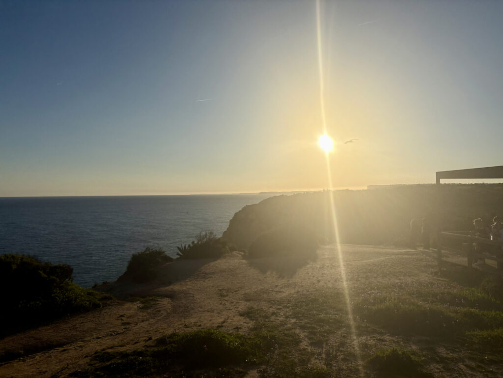 Pokračuji zbylých 5 kilometrů po dřevěných chodníčcích, které obepínají útesy u Lagosu. Sluníčko pomalu zapadá a já obcházím celé město. Z hlavní trasy neustále vystupují další chodníčky na vyhlídky přímo nad útesy. Potkávám mraky lidí, ale je mi to jedno. V 18:50 stojím u sochy Statue of Saint Goncalo in Lagos. Tím pro mě Fishermans Trail končí. Je to hustý! Moc jsem si ho užil. Na chodníčkách jsem sice trpěl, ale smál jsem se od ucha k uchu. Lidi se pak smáli taky.
